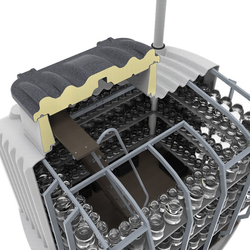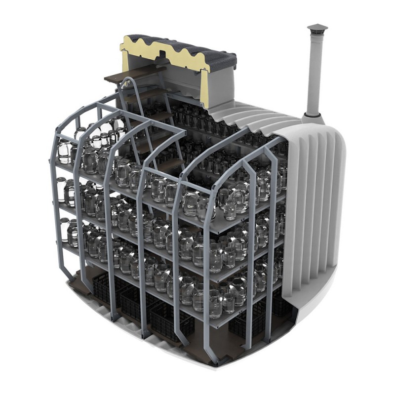 Большое внутреннее пространство на 8000 литров позволяет с комфортом перемещаться внутри. На широких полках можно в среднем разместить до 315 банок разного объема, а в нижнем пространстве еще дополнительно 15 ящиков с овощами и фруктами.